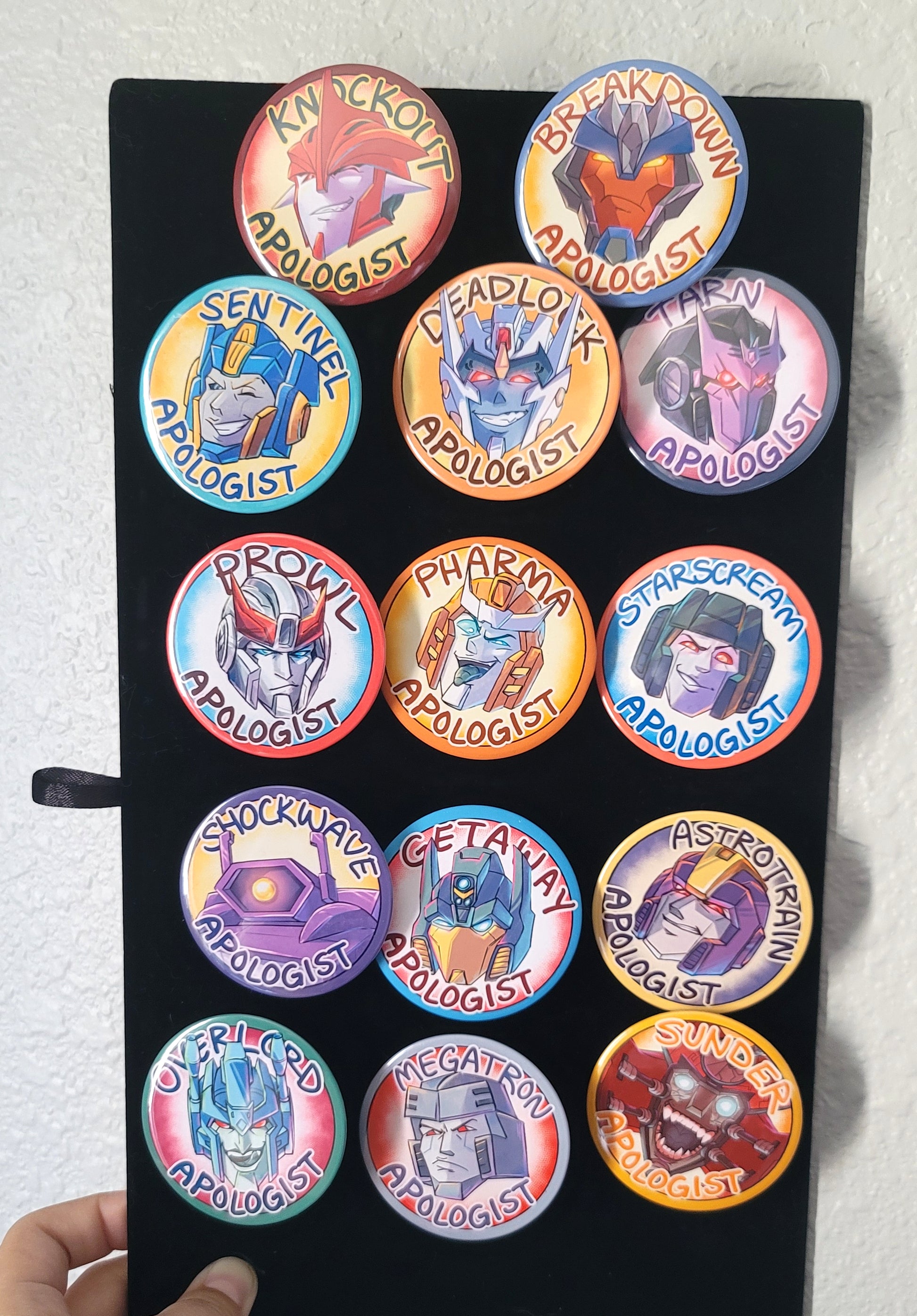 Show off your horrendous taste in robot men to the rest of the world with pride via a very nice button. Think Megatron had a point? Do you look at Sentinel and think, yeah smash. Then this button is for you. Wear it proudly. Unless it's Sunder. More coming soon!